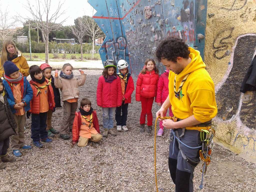 Barranquismo Madrid, escalada scout (2) Monitor enseñando a sus niños Hoy tenemos a un grupo de «castores» que quieren aprender a escalar