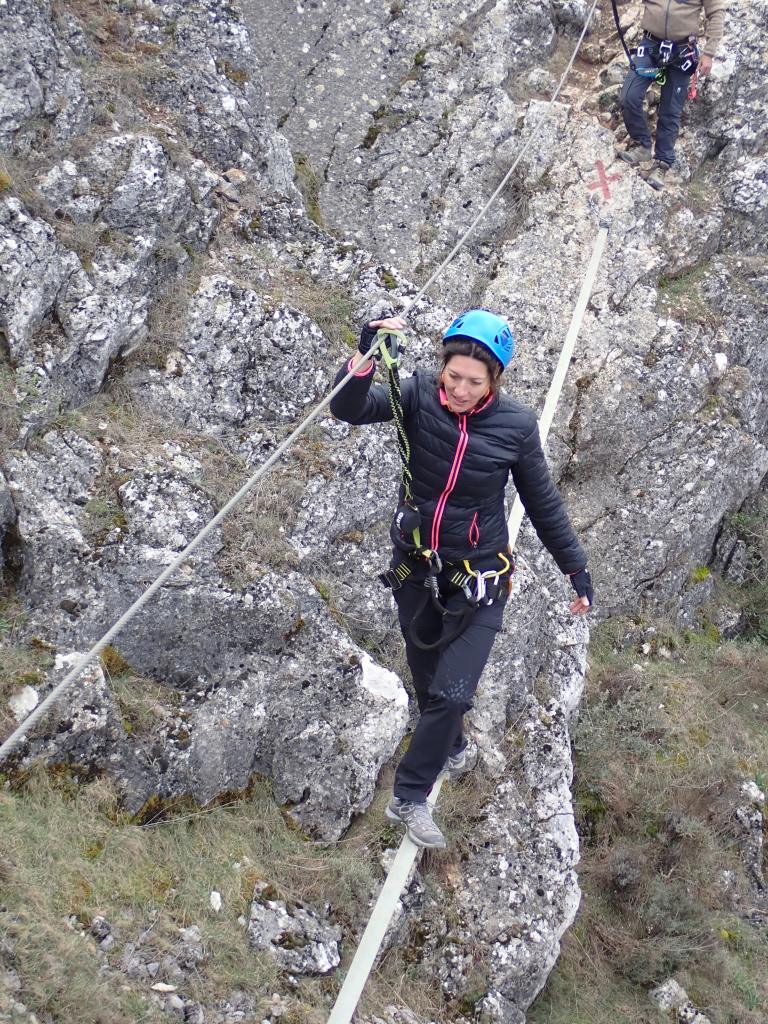 Es una vía ferrata muy facilita. La pueden hacer hasta niños acompañados. Aunque coge bastante altura, no tiene ningún paso difícil, y los escalones están muy próximos unos de otros.